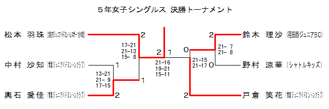 | 三原 小春 (能見台ジュニアバドミントンクラブ) | × 14-21 22-20 13-15 | ○ 21-17 22-20 | ○ 19-21 21- 6 15- 9 | 2 | |