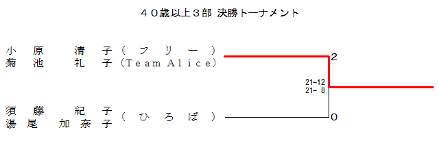 | 小原 清子 (フリー) 菊池 礼子 (Team Alice) | ○ 21-15 21-12 | ○ 21-16 14-21 21-10 | ○ 21-11 21-14 | 1 |