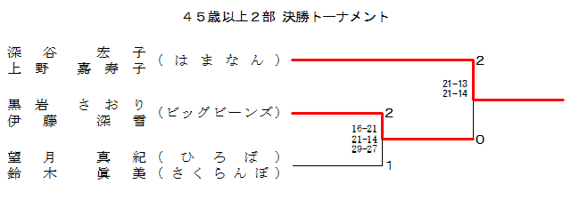 | 45歳以上2部 Aブロック | 深谷 上野 | 吉田 大橋 | 望月 飯村 | 山田 山口 | 順位 |