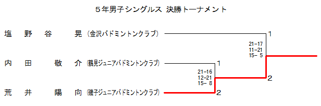 | 内田 敬介 (鶴見ジュニアバドミントンクラブ) | ○ 21- 9 21-15 | ○ 21-17 18-21 15- 6 | 1 | |