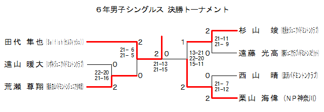 | 杉山 竣 (能見台ジュニアバドミントンクラブ) | ○ 21- 9 21- 8 | ○ 21- 1 21- 4 | 1 | |