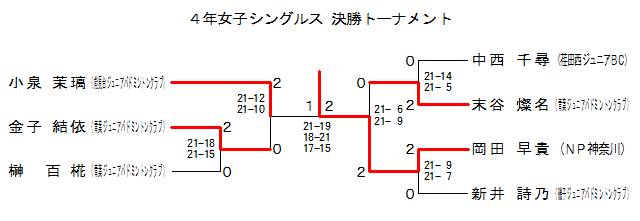 | 中西 千尋 (荏田西ジュニアBC) | ○ 21-12 28-30 15-10 | ○ 23-21 19-21 15-11 | 1 | |