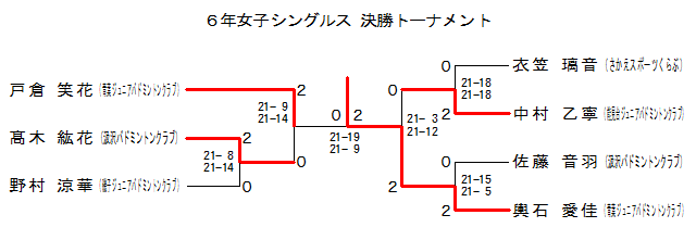 | 戸倉 笑花 (青葉ジュニアバドミントンクラブ) | ○ 21- 7 21- 9 | ○ 21-19 21-17 | ○ 21- 5 21- 6 | 1 | |