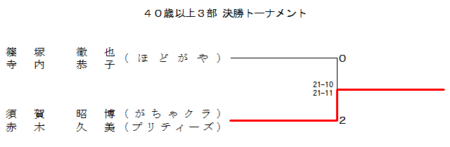 | 40歳以上3部 Bブロック | 河野 渡辺 | 本多 金 | 石部 若月 | 須賀 赤木 | 順位 |
