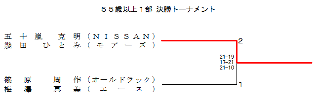 | 篠原 周作 (オールドラック) 梅澤 真美 (エース) | ○ 21-13 21-10 | ○ 21-15 21- 9 | ○ 21-13 21-17 | 1 |
