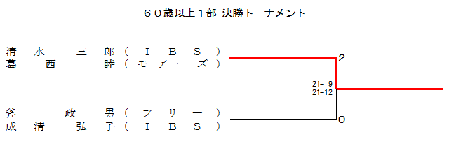 | 清水 三郎 (IBS) 葛西 睦 (モアーズ) | ○ 21-13 21- 9 | ○ 19-21 21-15 21-17 | 1 | |