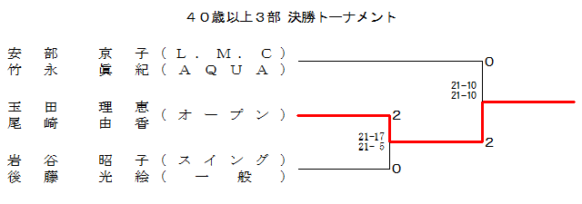 | 40歳以上3部 Bブロック | 岩谷 後藤 | 飯塚 山川 | 村上 柳 | 順位 |