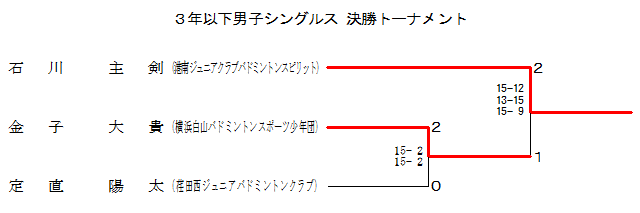 | 石川 主剣 (港南ジュニアクラブバドミントンスピリット) | ○ 15-12 9-15 15- 9 | ○ 15- 8 15- 4 | ○ 15- 3 15- 3 | 1 | |